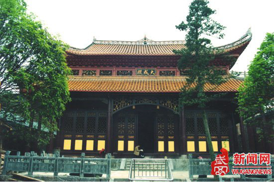 文庙大成殿,原亦称学宫,夫子庙或圣庙,在武冈县城内南门街。《武冈州志疆域志一》四页载:曰 学前街,自南门街西至小西门街,街之左滨渠水,街之右为学宫,中有双杏、学正署、训导署、明伦堂、魁星阁。州志《政绩略》亦载:(陶)侃明于形家言,令武冈时,考卜学宫基地,手植双杏今学宫是也,大成殿前庑檐下,有文字记载为清咸丰十一年(1861)辛酉岁丙申明月庚子日辰时修建迄今。大成殿为重檐屋顶,砖木结构,下檐开面三间,各间空扩4米,空高4米,庑周回廊,宽2 米,上檐退进一圈,面开棂窗,各檐花格浮出,呈弧形式至檐口,里间彩绘藻井,画珍禽异兽。下檐四角塑贴瓷龙头,上檐四角为龙尾。脊顶饰宝胡芦,两端塑雄狮一对。全殿覆置琉璃瓦金色映目,大成殿结构精美,庭宇雄伟。